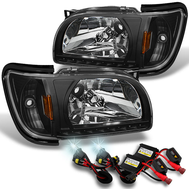 AKKON - For 2001-2004 Tacoma 1 Piece Black Headlights w/ Black Trim Corner Signal Lamps + Slim 8000K Blue White HID