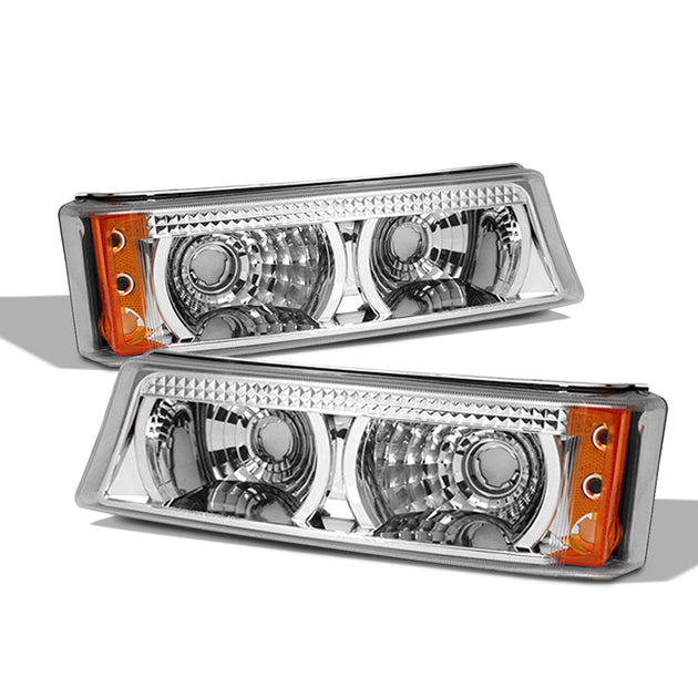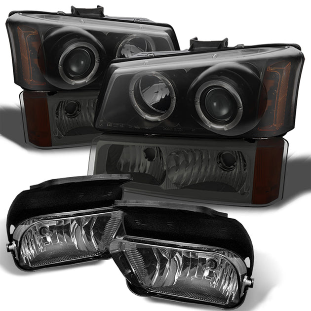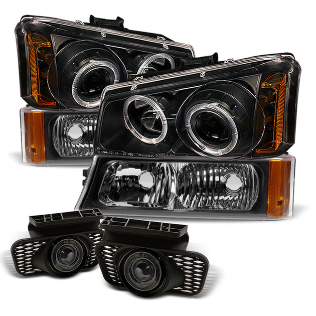 AKKON - For 2003-2006 Chevy Silverado Avalanche Dual Halo DRL Projector Headlights + Bumper Lamps + Fog Lights [Black Housing]