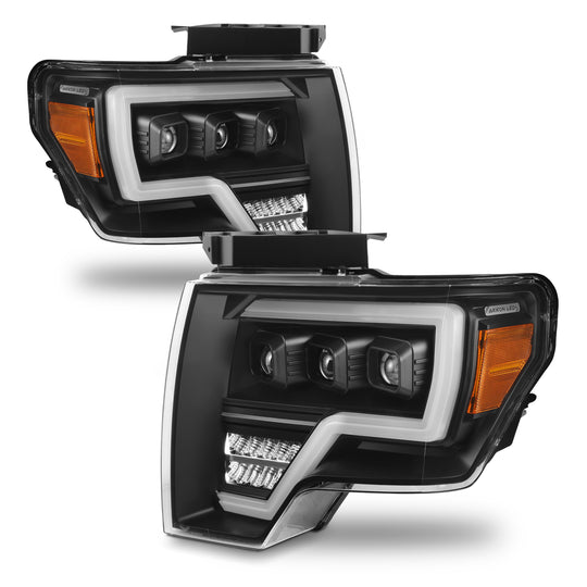 AKKON - Fit 2009-2014 Ford F150 Pickup Truck [Full LED] Projector Beam Black Headlights + [C-Light Bar] Chrome Smoked Tail Light