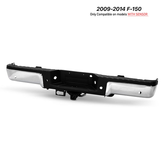 Regular price $396.99This is a 100% brand new piece of Chrome Replacement Rear Bumper Compatible With: 2009-2014 Ford F-150 ***For Styleside Bed Model Only*** ***Built With Parking Sensor Holes & Base Towing Packing*** ***Hardware Brackets Lights and Step... -