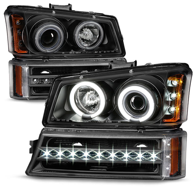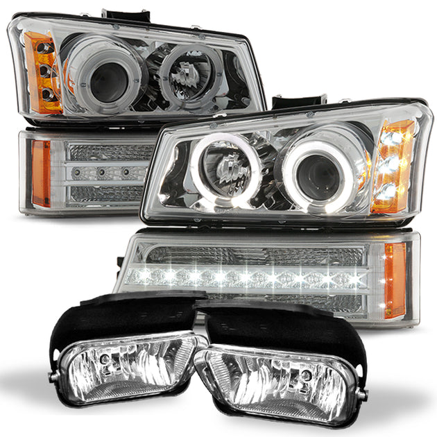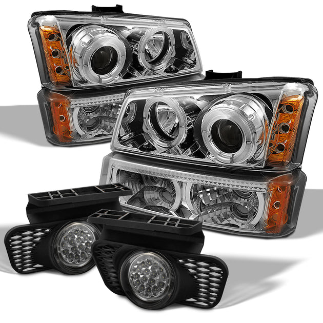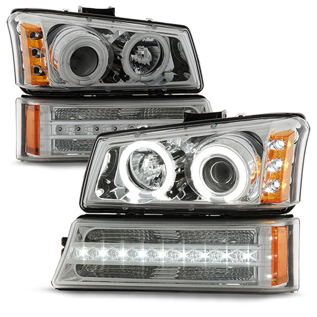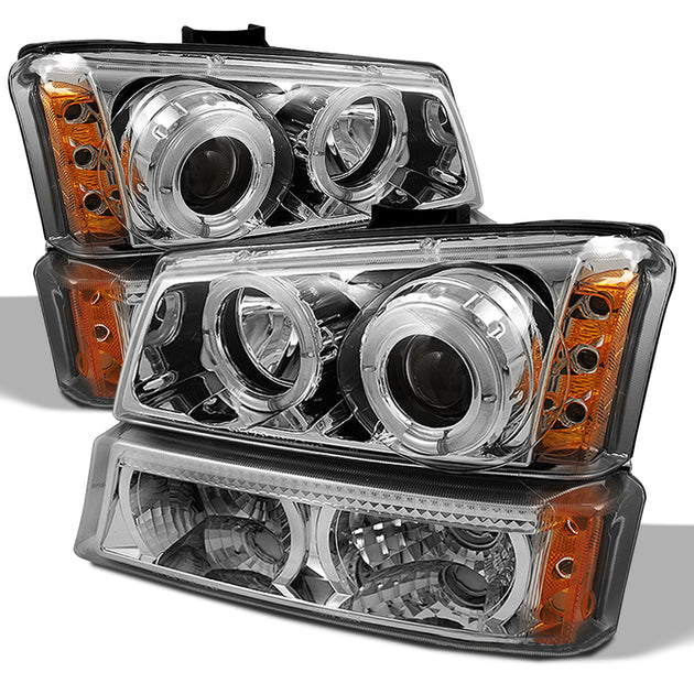 AKKON - For 2003-2006 Chevy Silverado Chrome Housing Dual Halo Projector Headlights + LED Halo Bumper Lights