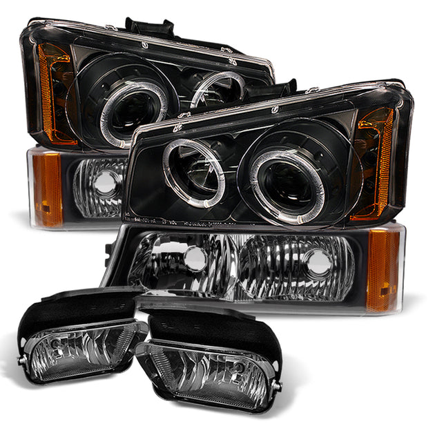 AKKON - For 2003-2006 Silverado Avalanche Black Housing Dual Halo DRL Projector Headlights + Bumper Signal Lamps + Fog Lights