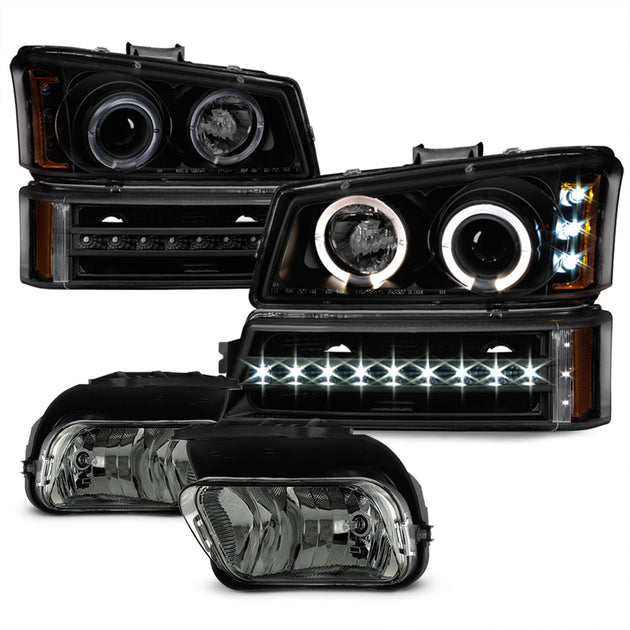 AKKON - For 2003-2006 Silverado Avalanche Smoke Halo DRL Projector Headlights Housing + Bumper Signal Lamps + Fog Lights
