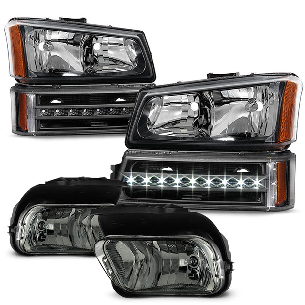 AKKON - For 2003-2006 Silverado | 03-06 Avalanche Black Headlights + LED DRL Bumper Signal Lamp + Smoked Fog Light Pair Combo