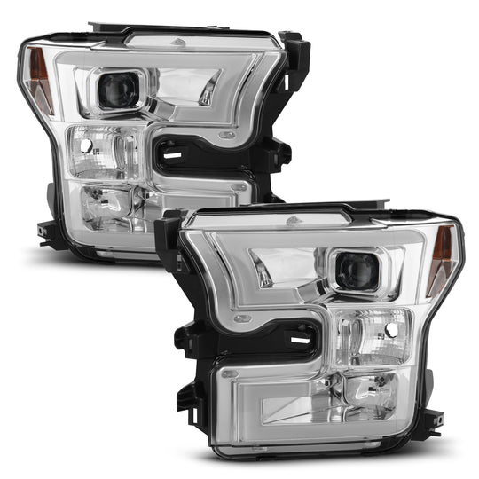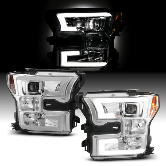 AKKON - Fits 2015 2016 2017 Ford F-150 [Halogen Type] Projector Chrome Headlights w/ [LED Low Beam] Tube Parking Running Pair