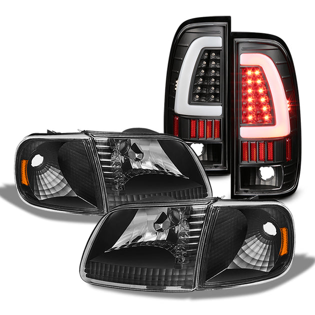 AKKON - For 2004 Ford F150 Heritage | 97-03 F-150 | 1997-1999 F-250 Black Headlights + LED Tube Bar Tail Brake Lights Combo Set