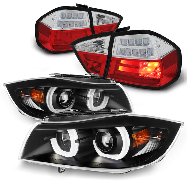 AKKON - For 2006 2007 2008 BMW E90 3-Series Sedan 3D LED U-Halo Black Projector Headlights + LED Strip Red Tail lamp