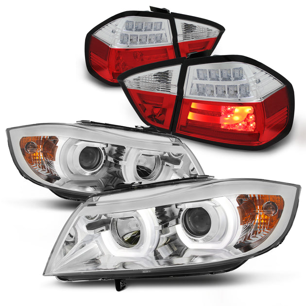 AKKON - For 2006 2007 2008 BMW E90 3-Series Sedan 3D LED U-Halo Chomr Projector Headlights + LED Strip Red Tail lamp
