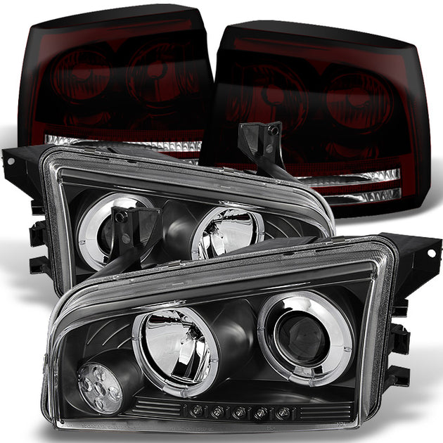 AKKON - For 2006-2008 Dodge Charger Model Black Halo LED Projector Headlights + Dark Red Smoked Tail Lights 4Pcs Combo