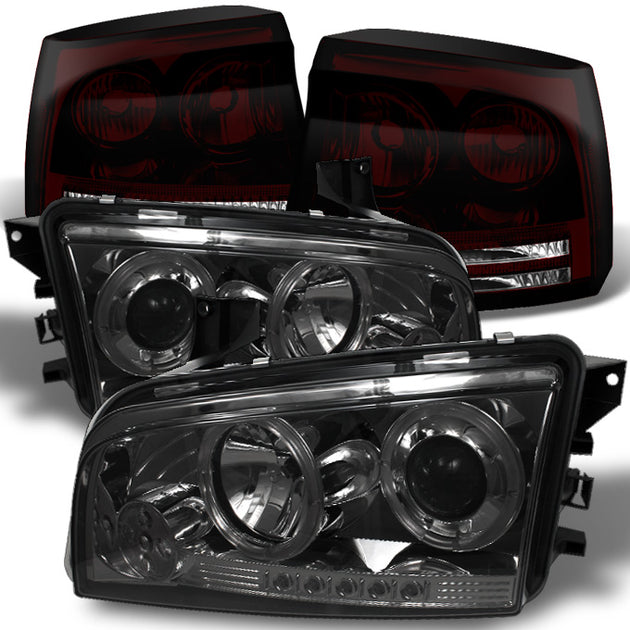 AKKON - For 2006-2008 Dodge Charger Smoked Halo Angel Eye LED Projector Headlights + Dark Red Smoked Tail Lights Combo