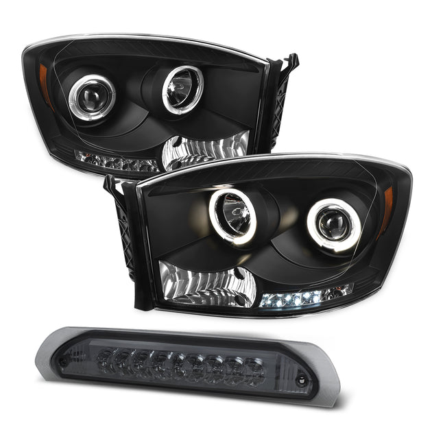 AKKON - For 2006-2008 Dodge Ram Black Housing Dual Halo LED DRL Projector Headlights + Smoked 3rd Brake Lamp