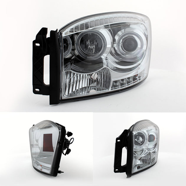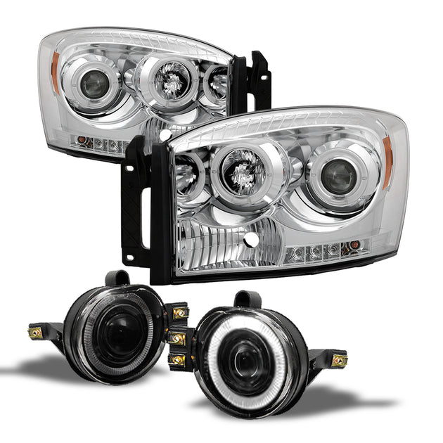 AKKON - For 2006-2008 Dodge Ram Chrome Housing Dual Halo LED DRL Projector Headlights + Projector Fog Lamp