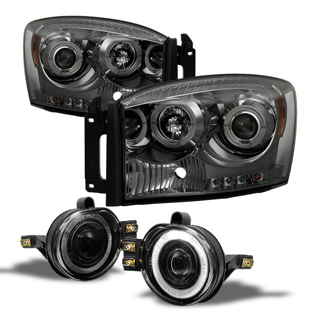 AKKON - For 2006-2008 Dodge Ram Smoked Lens Dual Halo LED DRL Projector Headlights + Projector Fog Lights Combo