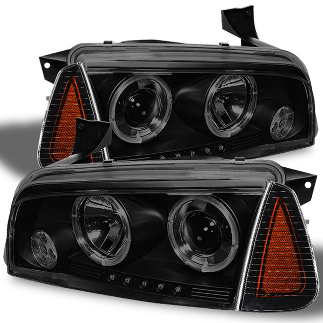AKKON - For 2006-2010 Dodge Charger LX Black Smoked Dual Halo Ring LED Projector Headlights + Amber Corner Lamp Pair