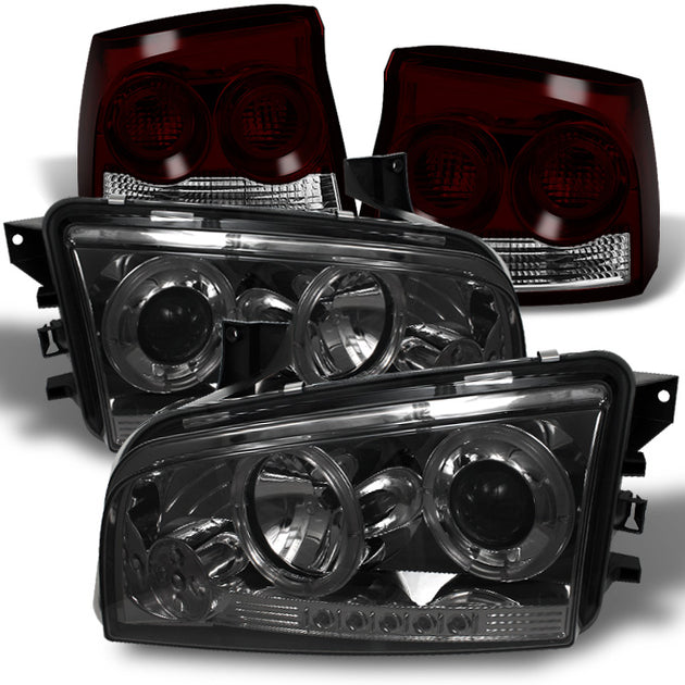AKKON - For 2009-2010 Dodge Charger Smoked Halo Angel Eye LED Projector Headlights + Dark Red Smoked Tail Lights Lamp