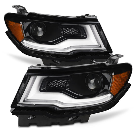 AKKON - Fits 2017-2021 Jeep Compass Halogen Reflector Type Projector Black Headlights Pair w/ LED Tube DRL Replacement