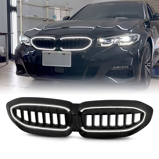 AKKON - Fits 2019-2022 BMW 3 Series G20 320i 330i Black Grille Front Bumper Grill +LED Tube Welcome Light w/Accessories