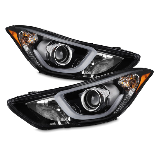 AKKON - Fit 2011-2016 Elantra Sedan [Halogen Type] LED Tube DRL Running Projector Black Headlights Pair Driver+Passenger