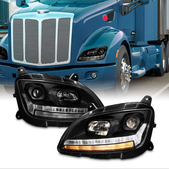 AKKON - Fit 2011-2019 Peterbilt 579 589 Class 8 Truck Black Projector Headlights w/LED Sequential Signal DRL Driver+Passenger