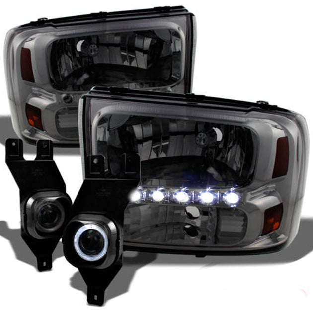 AKKON - For 99-04 Ford F250/350 SuperDuty LED Smoked Headlights + Smoke Halo Projector Fog Lights Left+Right Lamps Combo