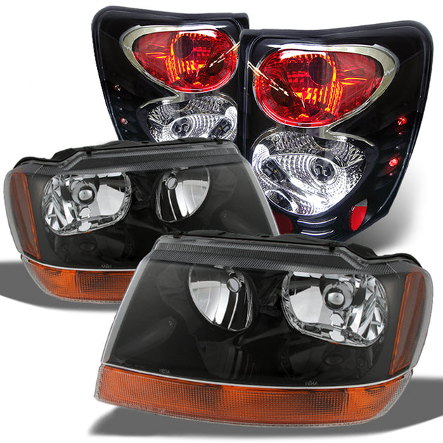 AKKON - For 99-04 Jeep Grand Cherokee Amber Black Headlights Replacement + Black Tail Lights Pair Left + Right Lamps Combo