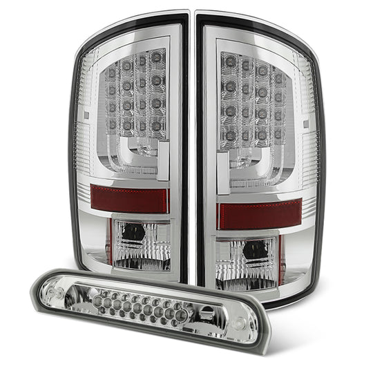 AKKON - For 02 03 04 05 06 Dodge Ram Chrome Bezel LED Tail Light + LED 3rd High Mount Cargo Brake Lamp Set