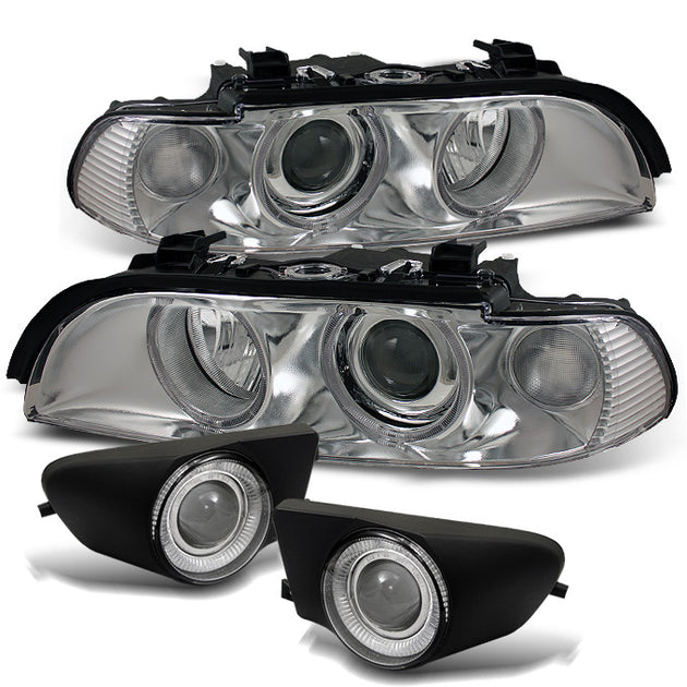 AKKON - For Chrome Housing 97-00 E39 5-Series [Dual Halo] Projector Headlights+ Halo Projector Fog Light 4Pcs