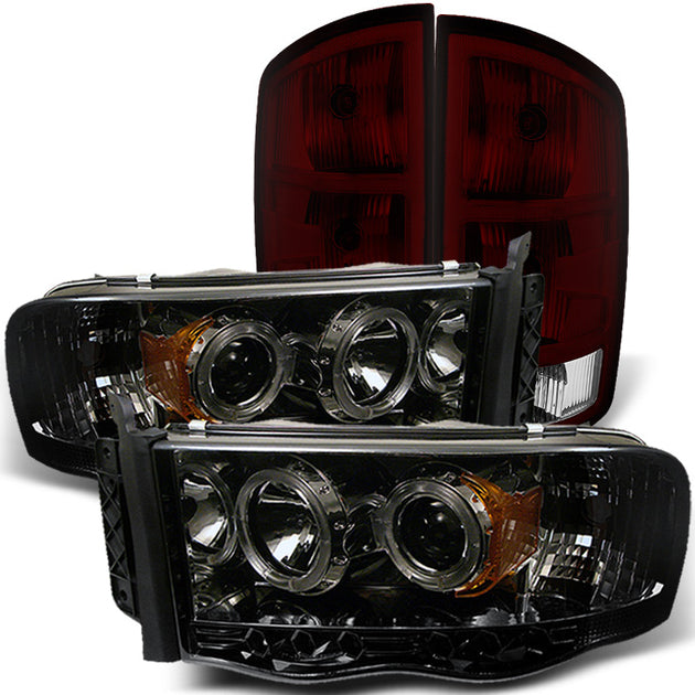 AKKON - For Dodge Ram 02-05 1500 | 03-05 2500 / 3500 Smoked Projector Headlights + Dark Red Tail Light Lamp