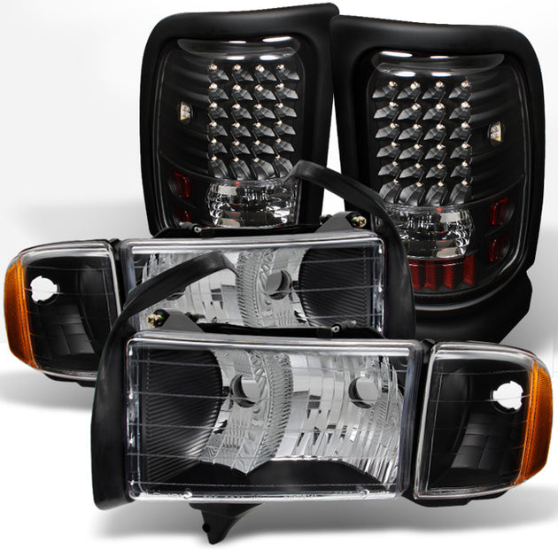 AKKON - For Dodge Pickup Ram 99-02 1500/ 2500/ 3500 Sport Black Headlight + LED Tail Brake Lamp Combo