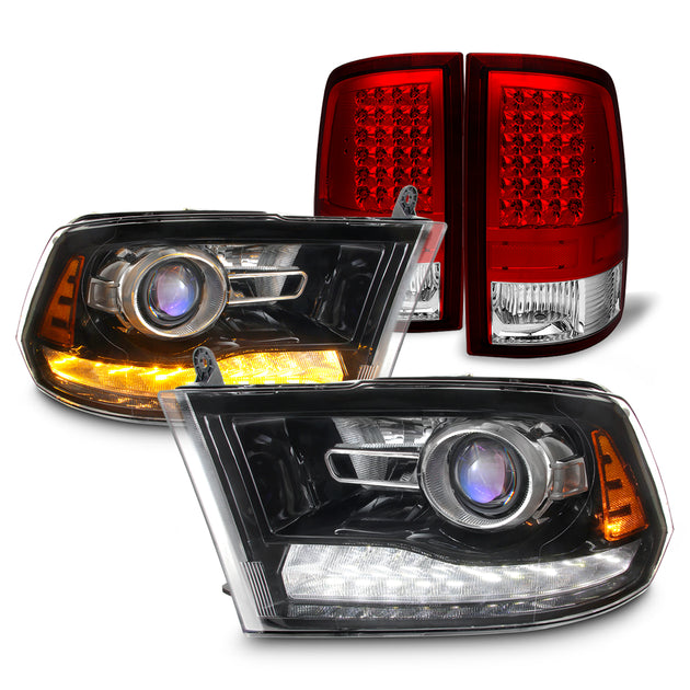 AKKON - For Dodge Ram 09-18 LED DRL Projector Black Headlights With LED Red Brake Lamp Taillights