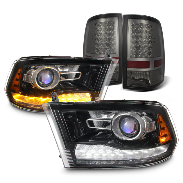 AKKON - For Dodge Ram 09-18 LED Bar DRL & High/Low Projector Housing + Tail Light Tube Style Smoked Lens