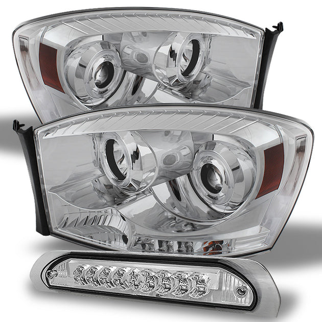 AKKON - For Dodge Ram 1500 2500 3500 Chrome Dual Halo Projector LED Headlights + Full LED 3Rd Brake Lamp