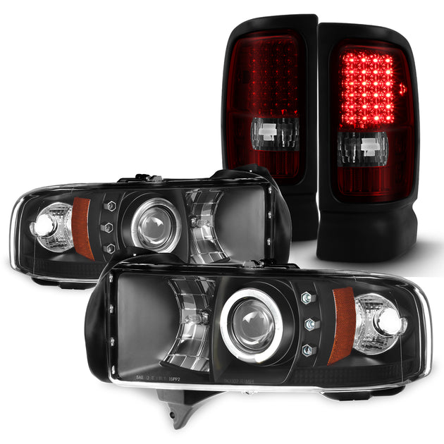 AKKON - For Dodge Ram 1500/2500/3500 Black Dual Halo Ring LED Projector Replacement Headlights + Tail Light Set
