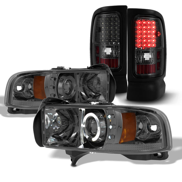 AKKON - For Dodge Ram 1500/2500/3500 Pickup Smoke Halo Ring LED Projector Replacement Headlights+Tail light