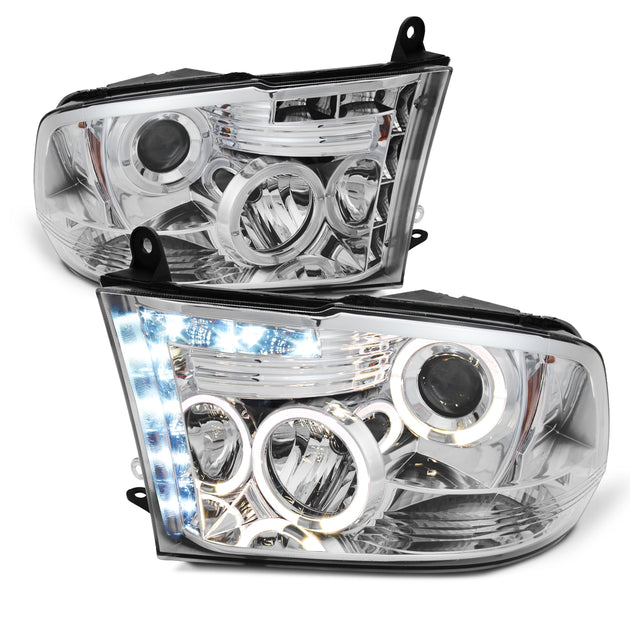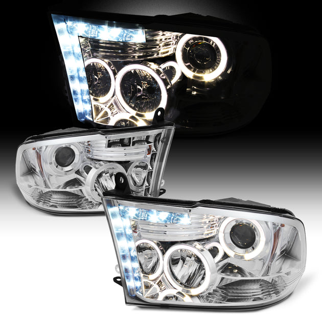 AKKON - For Dodge Ram Pickup Truck Chrome Clear Dual Halo Ring LED Projector Headlights Left + Right Replacement