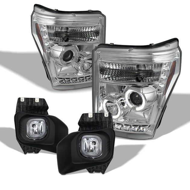 AKKON - For F-Series SuperDuty Pickup Truck Chrome Clear Dual Halo Ring LED Projector Headlights + Fog light W/ Switch + Wiring