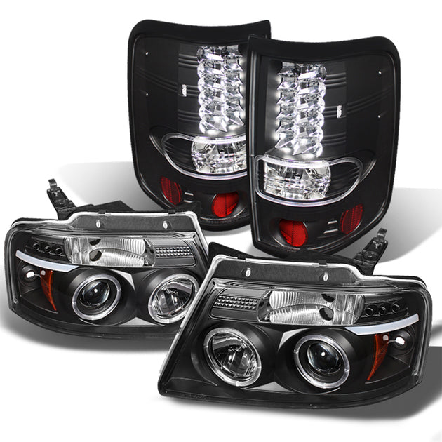 AKKON - For Ford F150 Pickup Black Bezel Dual Halo LED G2 Projector Headlights + Tail Lamp Set