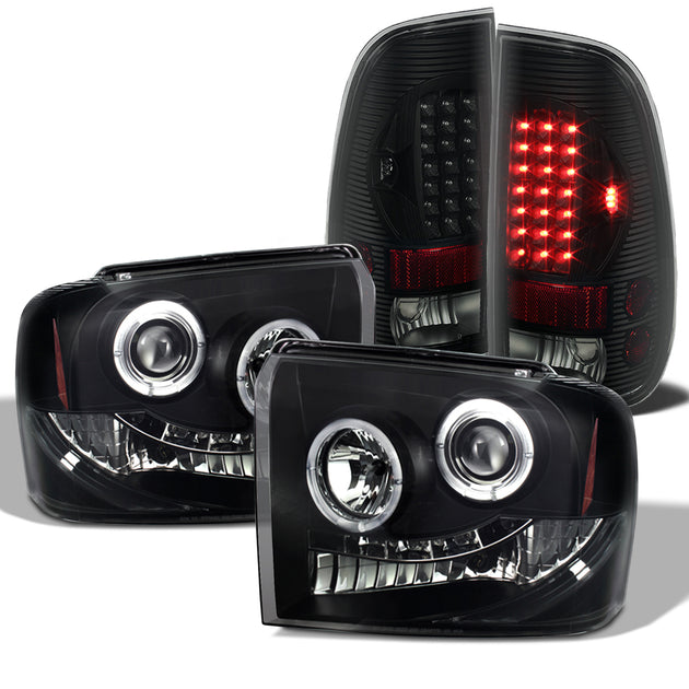 AKKON - For Ford F250/F350/F450/F550 SuperDuty Black Bezel Dual Halo Ring LED Projector Headlights + Taillights