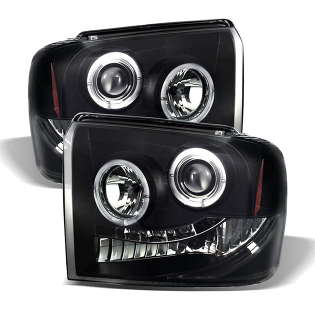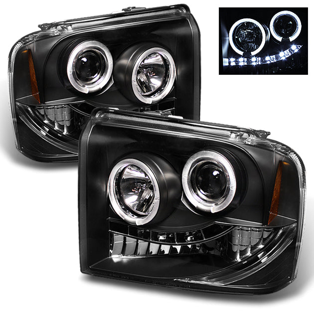 AKKON - For Ford F250/F350/F450/F550 SuperDuty 05 Excursion Black Bezel Dual Halo Ring LED Projector Headlights Pair