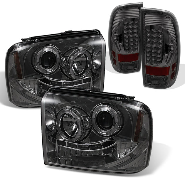 AKKON - For Ford F250/F350/F450/F550 SuperDuty Black Smoke Dual Halo Ring LED Projector Headlights + LED Tail Lamp
