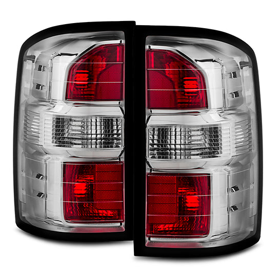 Regular price $59.99SKU: ALT-YD-NF05AP-GR-LED-BK This is a 100% brand new pair of Replacement Tail Lights in Chrome Clear Lens Compatible With: 2014-2018 GMC Sierra 1500 2015-2019 GMC Sierra 2500 HD/ 3500HD Compatible with Factory Incandescent Tail Light w/... -