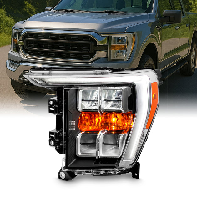 AKKON - Fit 2021 2022 2023 Ford F150 Halogen Type Projector Headlights w/LED Tube Light Bar Replacement Black Pair/Set