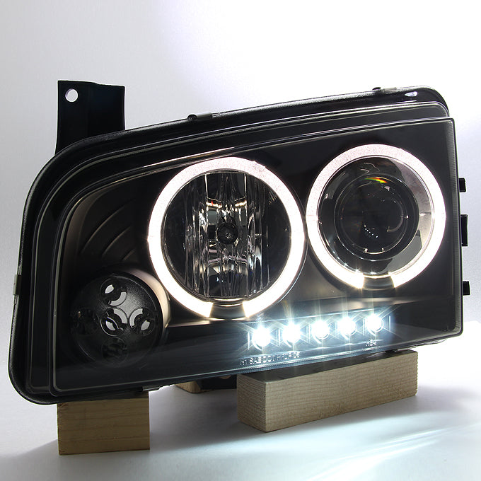 AKKON - For 2006-2010 Charger Black Bezel Dual Halo Ring DRL LED Projector Replacement Headlights Left+Right Side Pair
