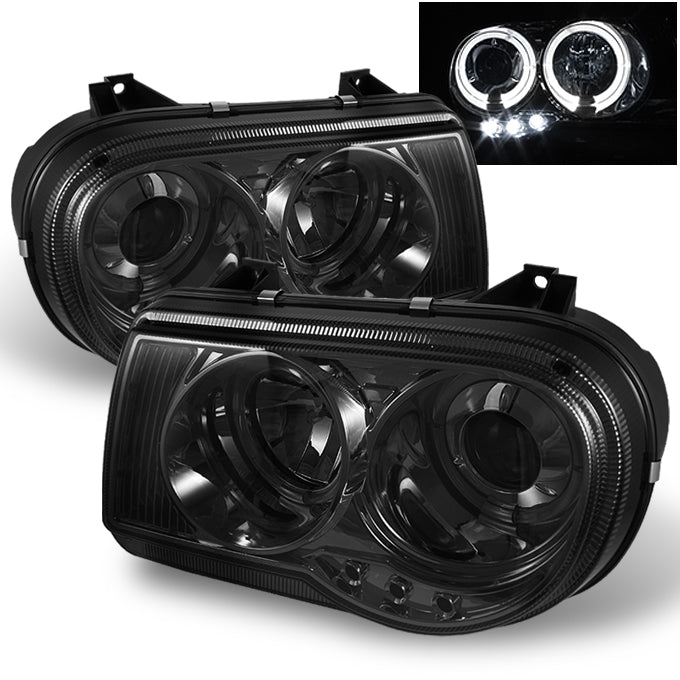 AKKON - For Chrysler 300C Sedan Halogen Type Smoked Smoke Dual Halo Rings Design Projector Headlights Lamps Pair
