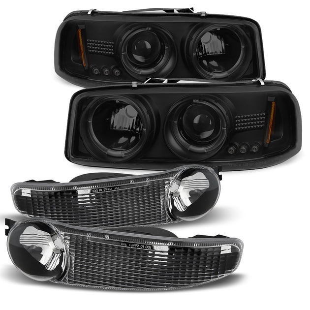 AKKON - For GMC Sierra Yukon Black Smoke Halo Projector Headlights + Bumper Signal Lights Replacement Combo
