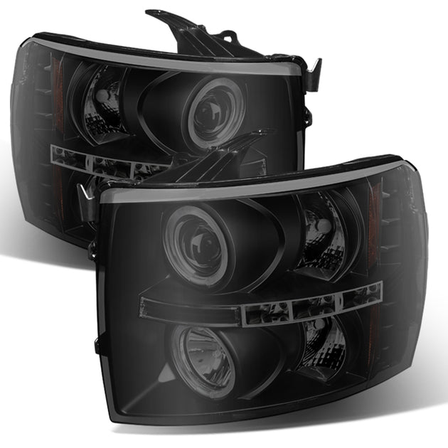 AKKON - For 2007-13 14 Silverado Pickup Black Smoked [Dual Halo Ring] LED Projector Headlights Left Driver + Right Passenger Pair
