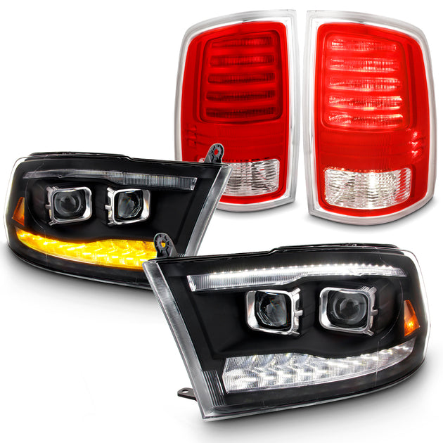 AKKON - Fits 2013-2018 RAM 1500 2500 3500 LED DRL [Dual Projector] Black Headlights+ LED Chrome Red Tail Lamp w/Wire Set