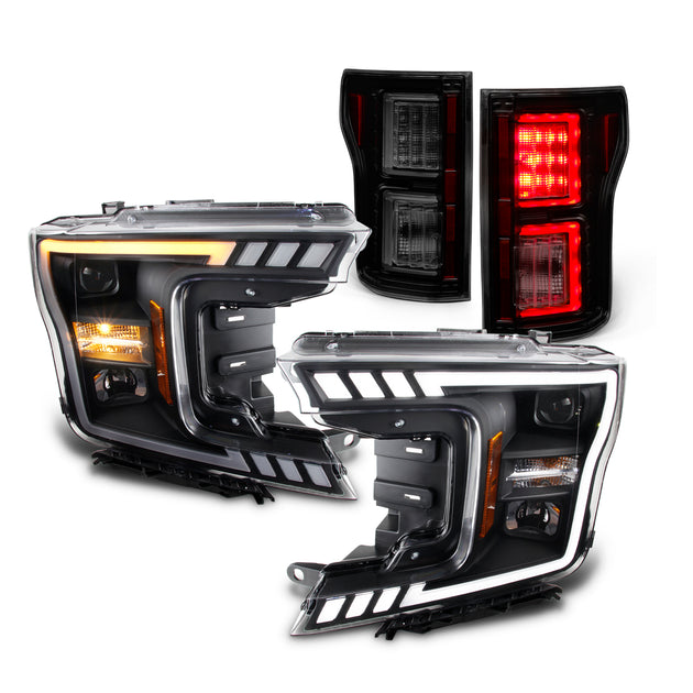AKKON - For 2018-2020 Ford F150 LED DRL Tube Black Projector Headlights With Sequential Turn Signal + Smoked LED Tail Light