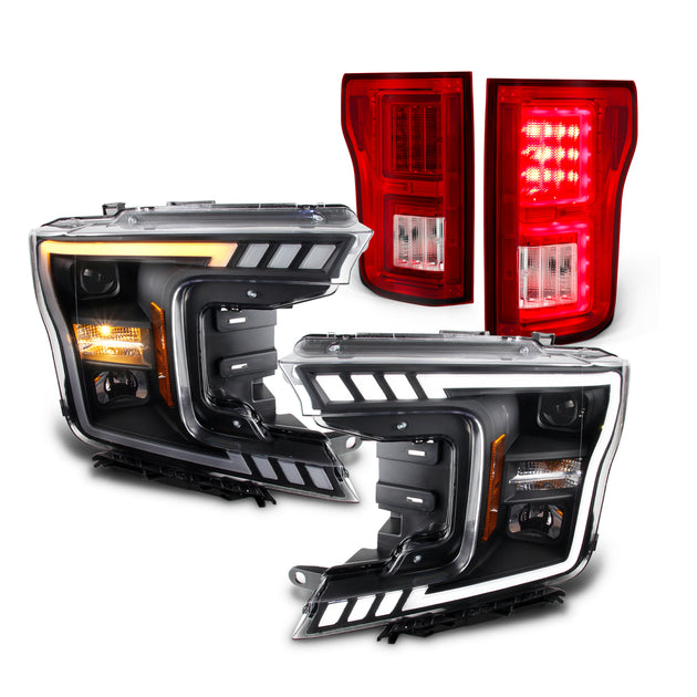 AKKON - For 2018-2020 Ford F150 LED DRL Tube Black Projector Headlights With Sequential Turn Signal + Red LED Tail Light