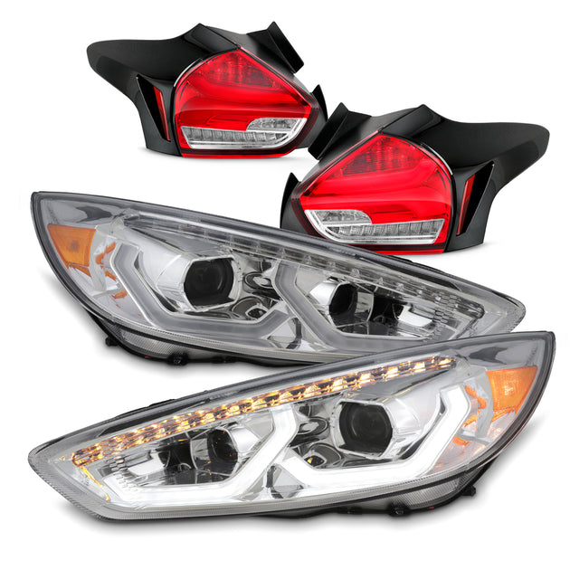 AKKON - Fits 2015-2017 Ford Focus Hatchback Full-LED Sequential Light Tube Projector Headlights + Tail Lights Combo